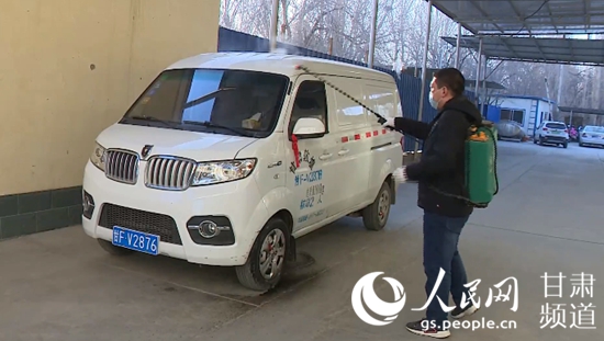 對車輛進行消毒處理。(敦煌市委宣傳部供圖)
