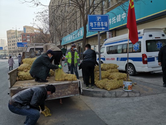 在街道黨工委的幫助協調下,伏龍坪街道三營村黨支部潤源起航農業合作社的農民兄弟,將3000斤土豆拉到了城關區新冠肺炎防治定點醫院區醫院。
