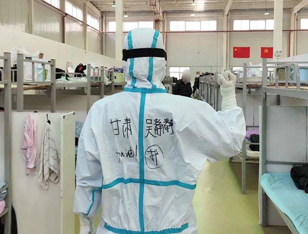 每天,你們穿著密不透氣的防護服,戴著口罩和護目鏡,辛苦地忙碌著,工作著。我們看不清你們的面容,但是我們能清清楚楚地看到你們防護服上的大字“甘肅”,我們能清清楚楚地看到防護服上的大字“加油”,我們能真真切切地感受到你們的愛。你們的這份情誼我們不會忘記,你們的這份大愛我們不會忘記。