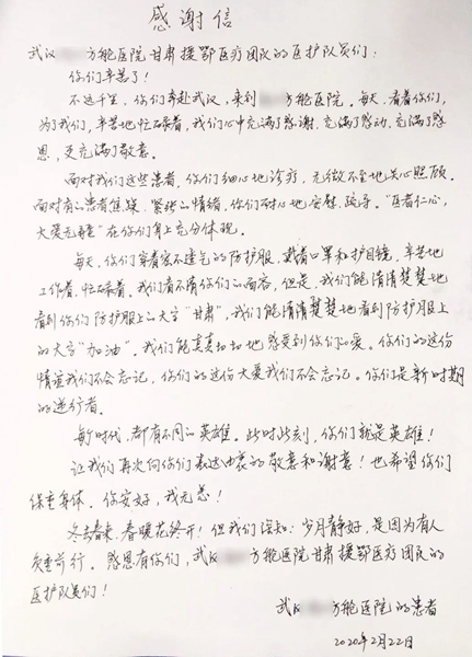 編者按:時下,新冠肺炎疫情防控工作到了最吃勁的關鍵階段。一段時間以來,各級黨員干部、醫護人員、警務人員、基層網格員等紛紛走上戰“疫”一線,也涌現了一批感人至深的請戰書、入黨申請書、家書、公開信等,其中不少書信情真意切,飽含熱度。為鼓舞士氣,弘揚正氣,人民網推出《戰“疫”書信》欄目。此次刊發的是武漢方艙醫院新冠肺炎患者寫給蘭州大學第一醫院支援湖北方艙醫院醫護人員的感謝信。蘭州大學第一醫院支援湖北醫療隊目前均已在湖北陸續開展醫療防控救治工作。