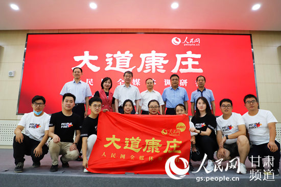 “大道康莊——人民網全媒體調研行”甘肅線采訪調研團成員與參加啟動儀式的嘉賓合影。(王文嘉 攝)