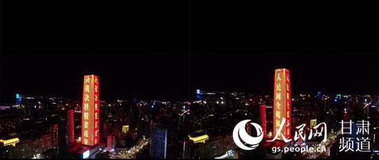 7月19日晚,位于蘭州市東方紅廣場的地標建筑鴻運·金茂亮起“決戰決勝脫貧攻堅”燈光秀。(魏怡 攝)