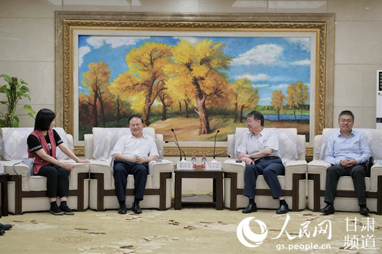 啟動儀式前,蘭州大學黨委書記馬小潔(右二)、蘭州大學黨委常務副書記吳國生(右一)會見人民日報社甘肅分社社長董洪亮(左二)、人民網副總裁宋麗云(左一)一行。(張若涵 攝)