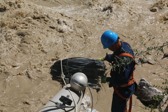 8月27日,蘭州供電公司支援隴南抗洪搶險隊經過連續10多個小時的搶修,在中路河畔重新立桿架線,架通了因暴雨損毀的隴南電網35千伏安中線11號桿塔,確保了當地老百姓的生活用電。