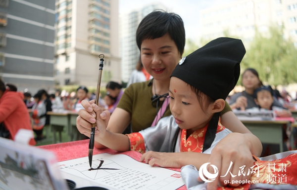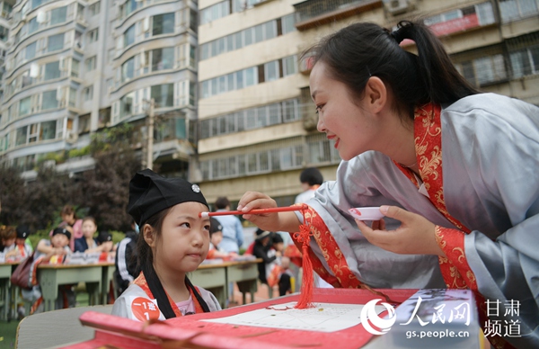 人民網蘭州9月2日電(魏怡)9月1日上午,蘭州市七里河小學西校區內500多名一年級新生身穿漢服,通過“端正衣冠”“感恩先賢”“朱砂啟智”“擊鼓鳴志”“啟蒙描紅”等活動,感受傳統的“開筆禮”。老師在孩子們的額頭輕點一顆朱砂紅痣,為孩子們“破蒙”,開啟智慧,以此寄托美好的愿望,孩子們用稚嫩的小手在描紅本上寫下大大的“人”字,由此步入上學求知的學生時代。讓孩子們把上學求知看成一個神圣的使命,提高學習興趣,培養孩子尊師重道、尊重長輩的品質。