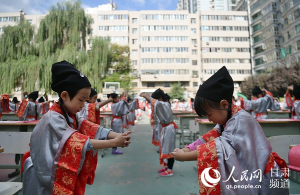 蘭州市七里河小學學生穿漢服向同學行禮(七里河宣傳部供圖)