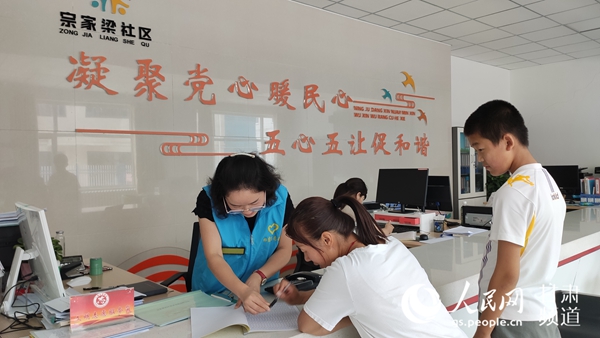 蘭州新區中川園區棲霞街道宗家梁社區工作人員正在為轄區租戶辦理孩子入學手續。(高翔 攝)