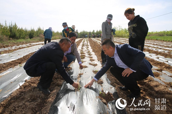 慶城縣、玄馬鎮紀檢監察干部和桑梨塬村干部查看萬壽菊輪播情況。(趙亮 攝)