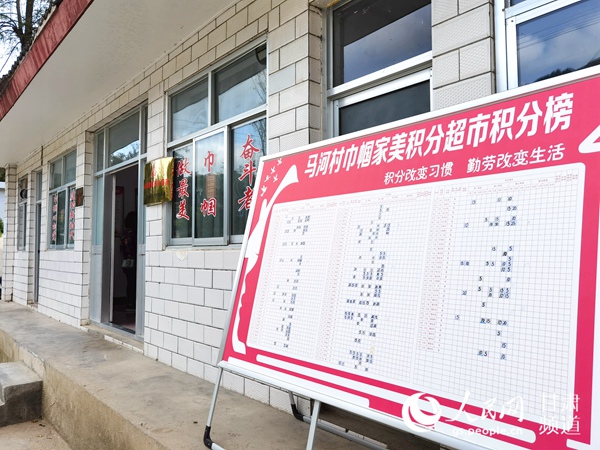 樹立在馬河村村委會大院里的巾幗家美積分超市積分榜。(高翔 攝)