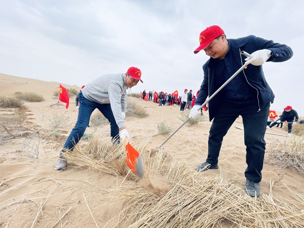 在隨后開展的壓沙活動中,300多人分組在指定區域按縱橫交錯的方式劃線、犁溝、鋪草,一個個草方格漸次鋪開,向著沙漠腹地延伸……
