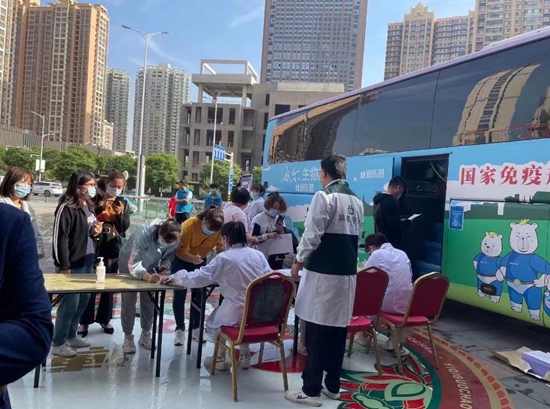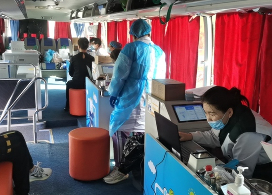 群眾在流動疫苗接種車外登記準備接種新冠疫苗。(蘭州市城關區委宣傳部供圖)