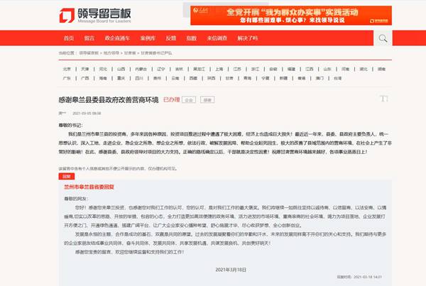 “最近一年來,皋蘭縣委、縣政府主要負責人始終堅持深入工地、走進企業,急企業之所急,想企業之所想,依法行政,破解發展困局,幫助企業起死回生,極大改善了縣域范圍內的營商環境,在社會上產生了非常好的影響!在此,感謝縣委、縣政府領導對項目的大力支持。祝愿甘肅營商環境越來越好,各項事業蒸蒸日上!”日前,甘肅省蘭州市皋蘭縣的一位投資商在人民網“領導留言板”上對皋蘭縣委、縣政府優化營商環境,為企業發展貼心服務進行了“點贊”。