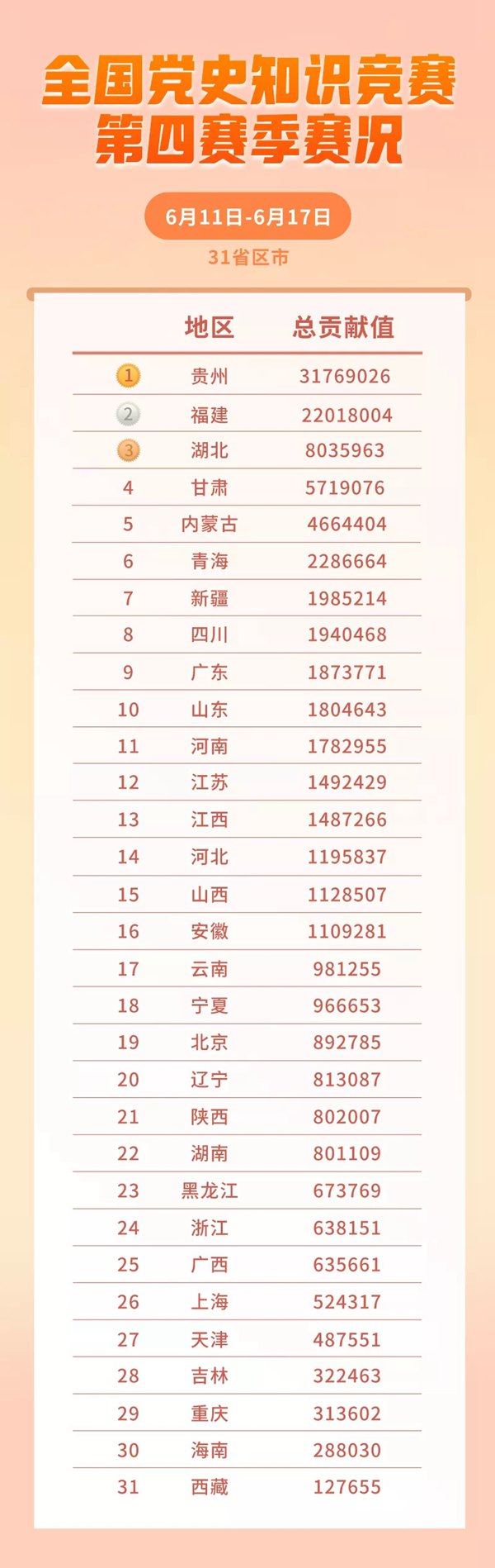 人民網蘭州6月21日電 (黃帆)由黨史學習教育官網、人民網聯合主辦的“全國黨史知識競賽”活動5月21日啟動。日前,“全國黨史知識競賽”第四賽季(6月11日-6月17日)榜單揭曉:貴州以31769026的總貢獻值蟬聯榜首;福建以22018004的總貢獻值保持在第二位;湖北以8035963的總貢獻值穩居第三位;甘肅則以5719076的總貢獻值繼續保持在第四位。