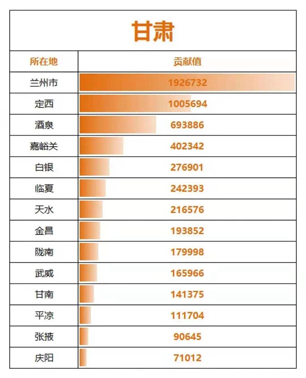 從甘肅省各市州情況來看,蘭州市以1926732的總貢獻值領先于甘肅省其他地市,與定西(總貢獻值:1005694)、酒泉(總貢獻值:693886)繼續領跑全省。嘉峪關后來居上,以402342的總貢獻值由上一賽季的全省第十三位上升到第四位。天水以216576的總貢獻值由由上一賽季的全省第九位上升到第七位。