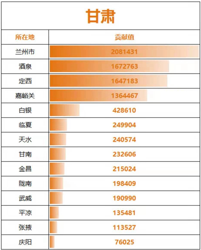 從甘肅省各市州第五賽季的情況來看,蘭州以2081431的貢獻值牢牢占據著省內榜首,酒泉以1672763的貢獻值反超定西,成為這一賽季的甘肅省“榜眼”,定西以1647183的貢獻值位列第三。嘉峪關(貢獻值:1364467)、白銀(貢獻值:428610)、臨夏(貢獻值:249904)和上一賽季排名一樣,占據著省內第四、五、六位。