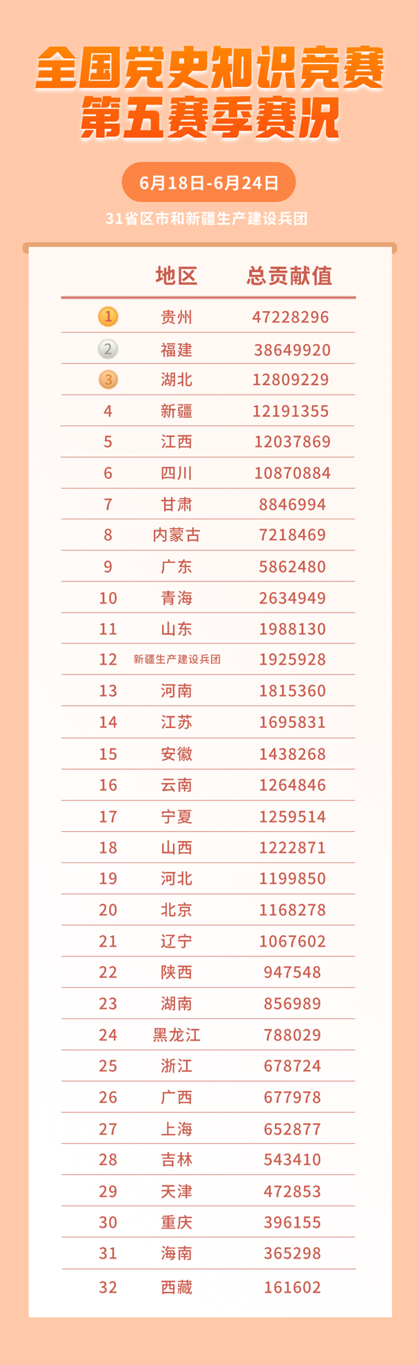 在“全國黨史知識競賽”第五賽季(6月18日-6月24日)的榜單中,貴州以47228296的總貢獻值再次蟬聯榜首;福建以38649920的總貢獻值穩居第二位;湖北則以12809229的總貢獻值繼續保持在第三位;甘肅的排名有所下滑,以8846994的總貢獻值由上一賽季的第四位下滑到第七位。