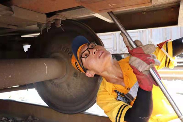 不一會功夫,陳尚文從車底鉆出,嘴里默念一句:“敲擊聲音未見異常,該輛車狀態良好!彼撓曼S色帽子擦擦汗接著向下一輛車走去。