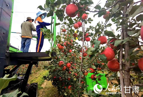 寧縣焦村鎮海升模式蘋果產業基地,種植戶正在采摘蘋果。人民網 高翔攝