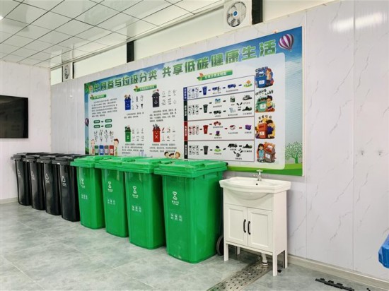 近日,記者尋到這座特別的“驛站”,在一片綠意盎然的樹叢后方,看到了小屋。陽光下玻璃房熠熠生輝,非常醒目,現代化感覺十足。小屋周圍綠色的仿真植物遍布,可愛的卡通形象做出歡迎姿勢引導居民進屋投放。再看垃圾分類屋內,除了設置好的分類垃圾桶,還有各類清晰的標識等。除此之外,小屋內還設置了定時封閉紫外線消毒設備和除臭設備,確保居民進入小屋丟棄垃圾時可以有一個好的環境,同時在內部還精心地設置了洗手臺,居民在丟棄完垃圾后可以隨時洗手。而進出小屋的臺階和便民緩坡也方便居民以及垃圾桶車進入。