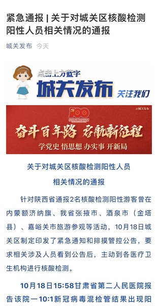 10月18日10:00左右步行前往甘肅省第二人民醫院門診進行核酸檢測;11:00在鐵路局菜市場;埘r面條店購買面條后回家;15:00前往甘肅省第二人民醫院附近小賣部(住院部出口向北第一家)購買香煙,之后到門診取核酸檢測結果,后因核酸混采結果異常被省二院隔離管控。
