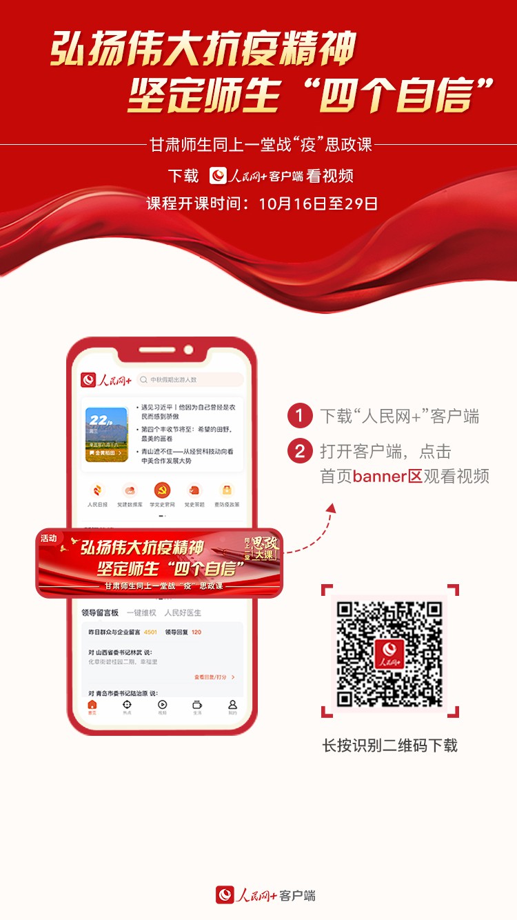人民網蘭州10月23日電 (王文嘉)弘揚偉大抗疫精神、堅定師生“四個自信”,10月16日,人民網聯合中共甘肅省委教育工作委員會、甘肅省教育廳共同推出了“同上一堂戰‘疫’思政課”,眾多甘肅師生和各地網友共同聆聽了身邊的戰“疫”故事。