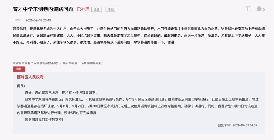 接到留言后,慶陽市12345政務服務便民熱線中心將留言轉辦至西峰區政府并進行了督辦。西峰區人民政府在留言回復中表示,育才中學東側巷內道路設計修筑標準低,不具備重型車輛通行條件。今年8月份西峰區市政部門進行銑刨作業后有重型車輛通行,且附近施工工地車輛借道,導致該巷道道路存在損壞現象。西峰區市政部門先后三次使用瀝青銑刨料進行臨時性回填,確保車輛通行。