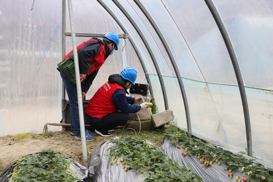 草莓園內,連心橋(隴南—金橄欖)共產黨員服務隊隊員細致檢查用電隱患。國網隴南供電公司供圖