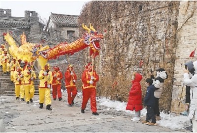 孩子們在北京古北水鎮內駐足觀看舞龍表演。