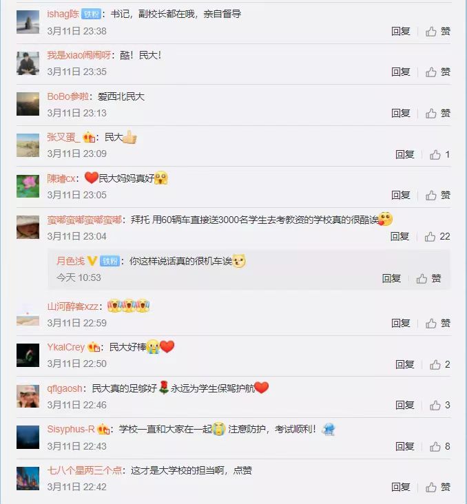 “學校一直和大家在一起,注意防護,考試順利!”“太暖心了,我的民大”“被學校和老師深深感動了”……兩所學校的暖心舉動也狠狠地“圈”了一波粉,網友們紛紛留言感謝學校,祝同學們考試順利!