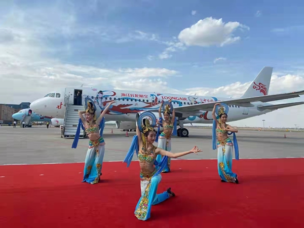 2021年7月16日,由甘肅省文旅廳聯合浙江長龍航空冠名打造的“飛天號”“如意號”飛機徐徐降落蘭州中川國際機場,標志著兩架彩繪飛機正式首航!帮w天號”“如意號”飛機作為甘肅文化旅游空中名片,通過浙江長龍航空遍布國內、通達亞洲的航線網絡走向世界,讓更多國內外游客領略了“交響絲路·如意甘肅”的獨特魅力,以航旅融合的獨特方式為甘肅文化旅游助力加分。兩架彩繪飛機自首航至今,累計執飛1582架次,飛行時間達3200多小時,品牌曝光量超過4000多萬人次。
