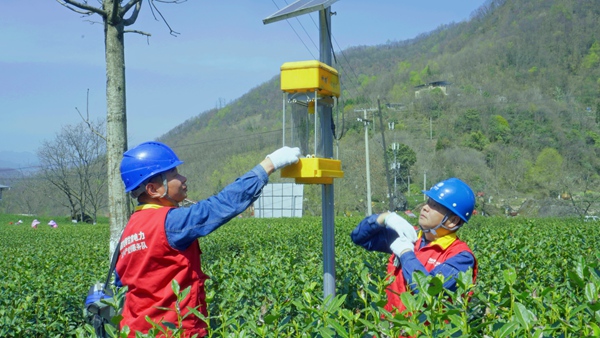 3月21日,國網隴南供電公司碧口供電所臺區工作人員在碧口鎮馬家山御澤春茶園基地檢查太陽能驅蟲裝置。王美惠攝
