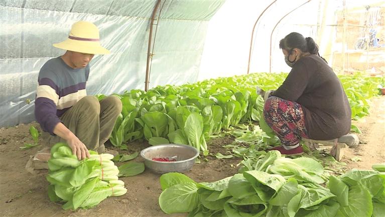 在下泥灣蔬菜設施農業生產基地,一座座溫室大棚錯落有致地排列在道路兩邊,走進溫室大棚,溫暖的氣息撲面而來,綠油油的生菜、黃瓜等長勢喜人,生機盎然,農戶正忙著采摘、分撿、裝箱,一片忙碌。