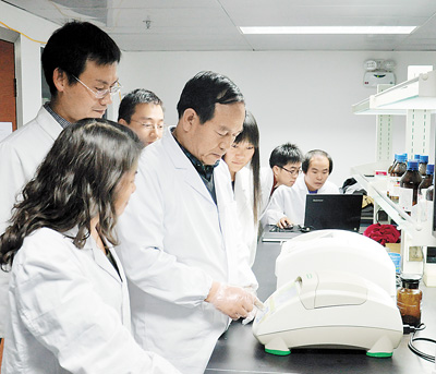 孫萬倉(中)帶領學生做實驗。本報記者 王錦濤攝