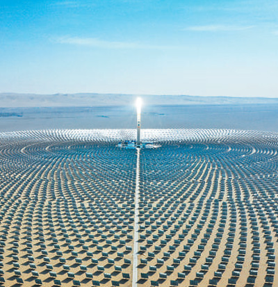 走進場區,宛若置身科幻世界:以這座260米高的吸熱塔為圓心,1.2萬塊定日鏡逐層散開,像向日葵上按層排列的一粒粒種子,其中最遠的一層距離塔心1.5公里。
