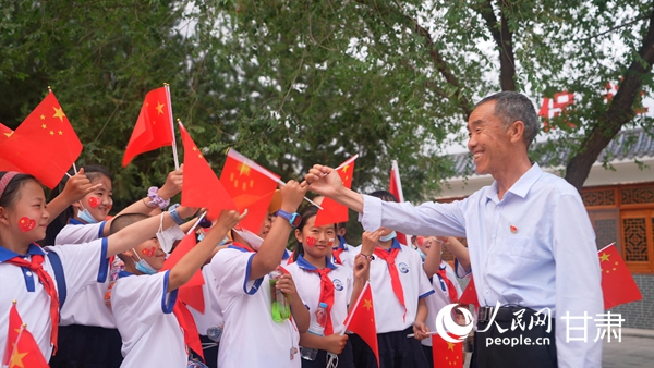 八步沙六老漢治沙紀念館外,郭萬剛與孩子們拉鉤,約定每人都要來種3棵樹。人民網 王文嘉攝