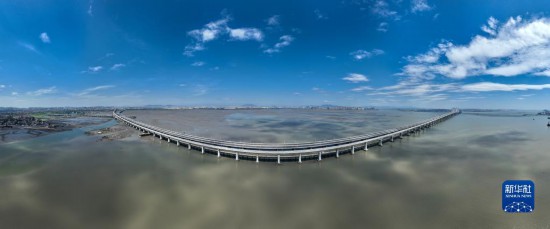 這是9月2日拍攝的新建福廈鐵路泉州灣跨海大橋(無人機合成照片)。