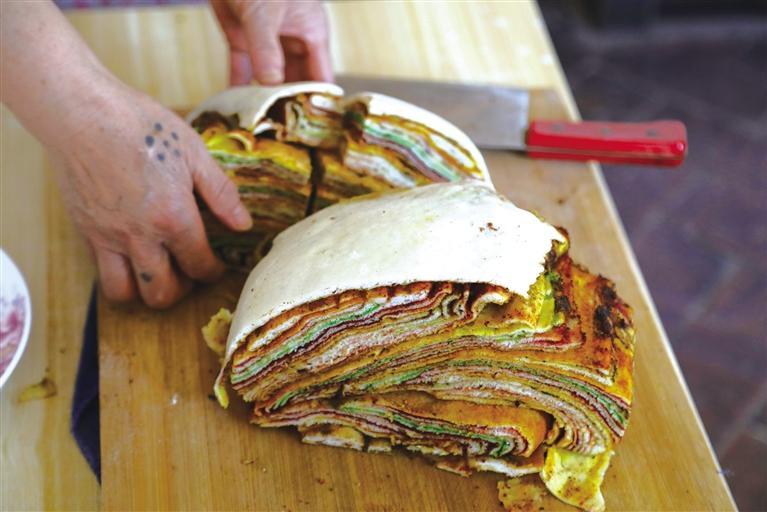 與機制流水線制作的月餅不同,“千層土月餅”是把發酵揉好的面搟成圓型之后,層層疊加,在每層面坨上都抹上胡麻油,再均勻撒上姜黃、紅曲、胡麻籽、玫瑰醬、苦豆、花椒葉等調味品,加入調味品的千層月餅一分為三疊放在一起,用一張白面皮把一摞色澤誘人的千層餅包起來,然后在千層月餅上做幾個面塑圖案,做好的千層餅放入大火燒開的蒸籠中,蒸一個小時左右才能熟透。
