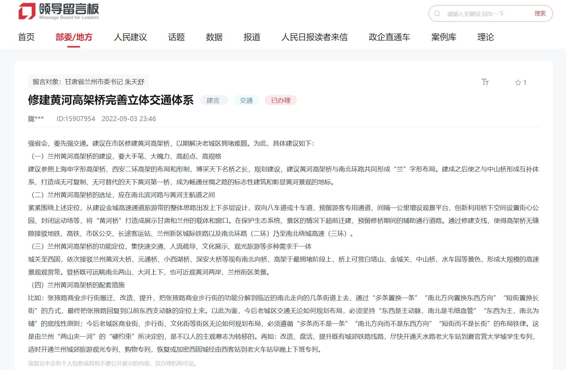人民建議|網友建議修建黃河高架橋完善立體交通體系 蘭州:已規劃