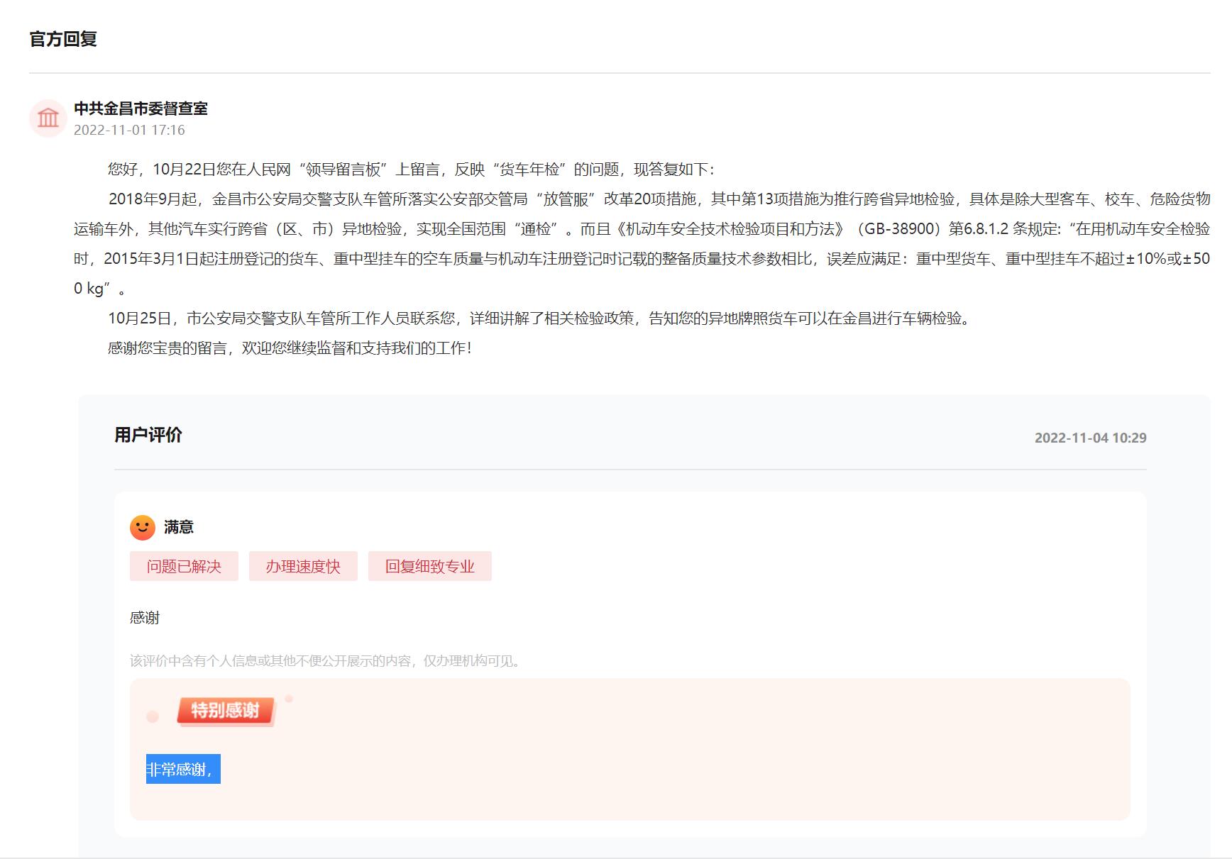 人民網蘭州11月13日電(記者邵蘭)近日,一個“滿意”的評價和一句“非常感謝”的“追評”出現在人民網“領導留言板”,這是一位通過留言板解決貨車年檢難題的網友給予的肯定評價。