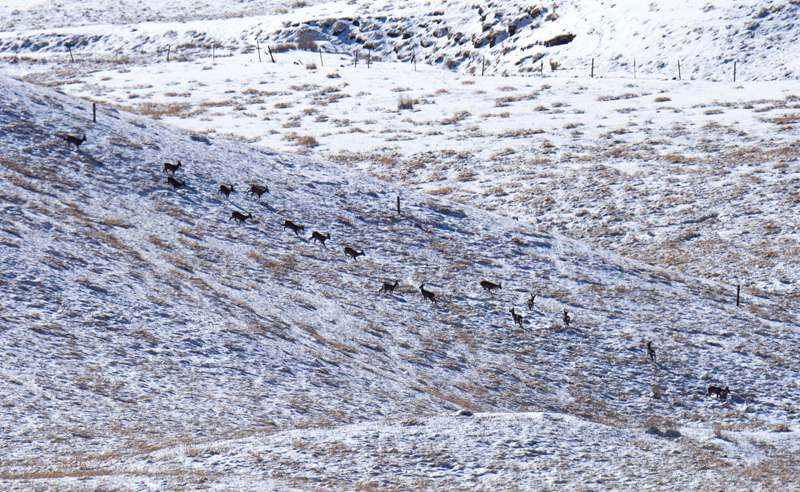 人民網蘭州11月14日電(記者邵蘭)11月12日,在祁連山國家公園民樂縣境內,成群的狍子出現在積雪覆蓋的山坡上,呈現出一幅人與自然和諧共生的動人畫面。