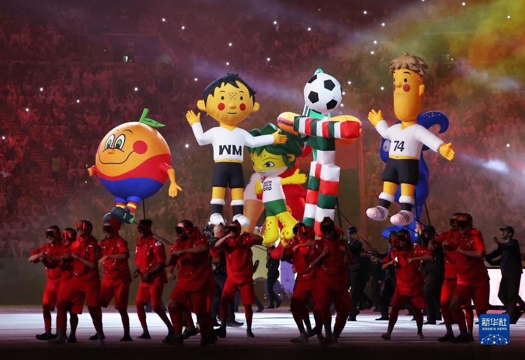 11月20日,歷屆世界杯吉祥物在開幕式上。