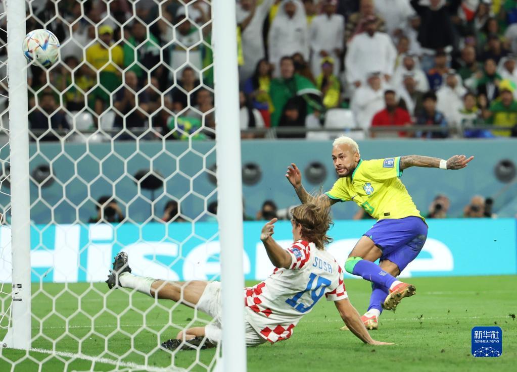 12月9日,巴西隊球員內馬爾(右二)在比賽中突破克羅地亞隊守門員利瓦科維奇(右三)的防守后射門得分。新華社記者 蘭紅光 攝