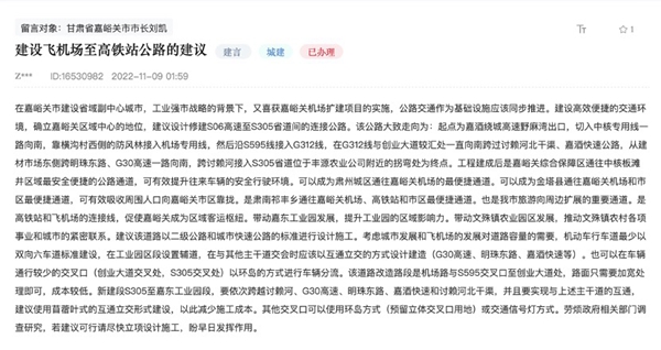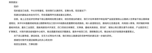 收悉留言后,嘉峪關市政府高度重視,安排嘉峪關市交通局就建議開展調研?!澳ㄗh的路線總體走向可行,符合酒(泉)嘉(峪關)兩市交通發展長遠需求。目前,省上正在征求甘肅省干線公路網規劃意見建議,結合您提出的建議,我們計劃申請將中核金塔產業園至鏡鐵山公路納入甘肅省干線公路網省道規劃,其中S06酒嘉繞城高速公路野麻灣出口至S305線路段是重要的組成路段。納入省道規劃后,路線向北連通金塔,向南接入青海,同時輻射串聯嘉峪關機場、嘉東工業園區、酒泉高新技術開發區、四〇四綜合保障區、文殊鎮、嘉峪關高鐵站、西溝礦、鏡鐵山等主要交通節點樞紐、產業園區和工礦聚集區,對嘉峪關市建設省域副中心城市,推動酒嘉雙城經濟圈建設,服務中核四〇四、酒鋼集團公司,推動地方經濟發展具有重要意義?!奔斡P市交通局及時回復網民留言,并主動與網民取得聯系,對相關情況進行了詳細說明。