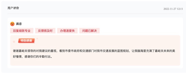 “謝謝嘉峪關領導對我建議的重視,看到市委、市政府和交通部門對城市交通發展的藍圖規劃,讓我腦海里充滿了對嘉峪關未來的美好憧憬,感謝你們的辛勤付出?!钡玫交貜秃?,該網友給予了“滿意”的評價。