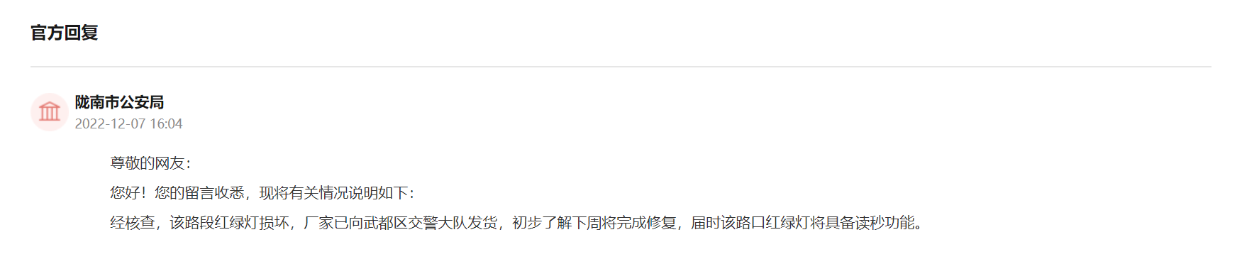 收到網民留言后,隴南市公安局及時進行了回復。經核查,該路段紅綠燈損壞,廠家已向武都區交警大隊發貨,將盡快完成修復,屆時該路口紅綠燈將具備讀秒功能。