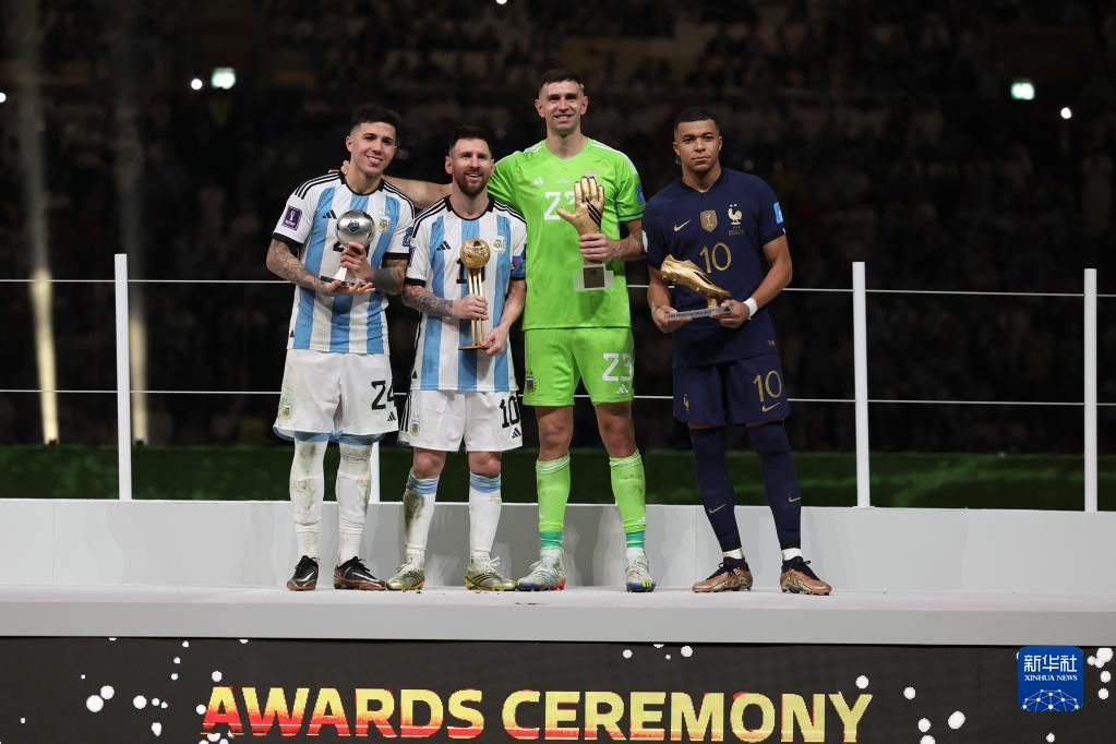 12月18日,在本屆世界杯上獲得最佳新秀獎的阿根廷隊球員恩佐·費爾南德斯(左一)、獲得金球獎的阿根廷隊球員梅西(左二)、獲得金手套獎的阿根廷隊守門員馬丁內斯(右二)與獲得金靴獎的法國隊球員姆巴佩在頒獎儀式上合影。新華社記者 曹燦 攝