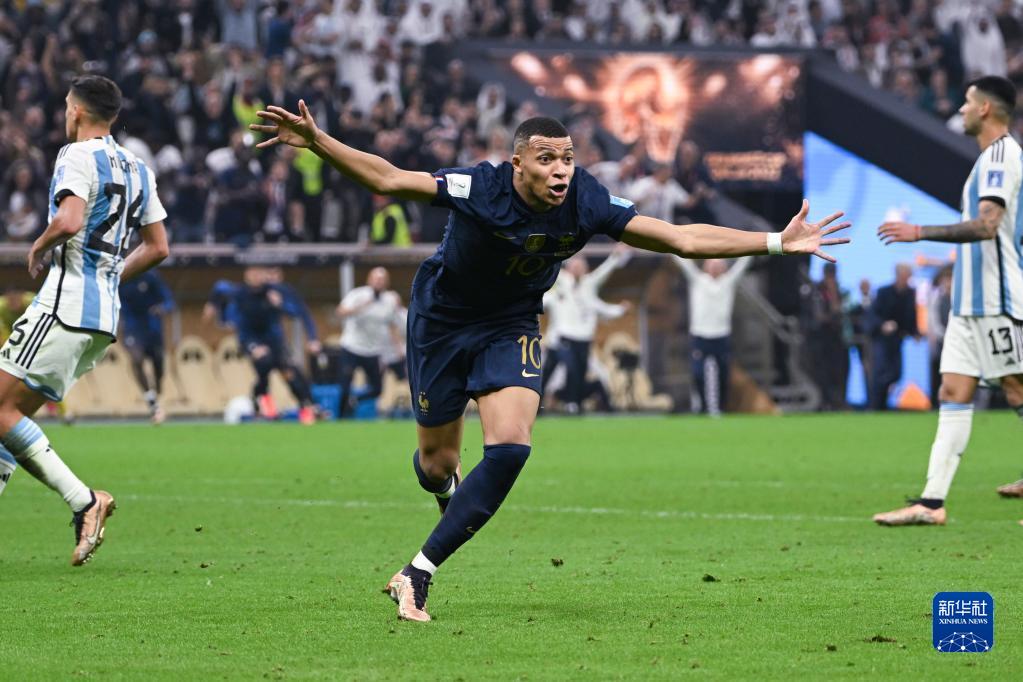 12月18日,法國隊球員姆巴佩(中)在比賽中進球后慶祝。新華社記者 李尕 攝