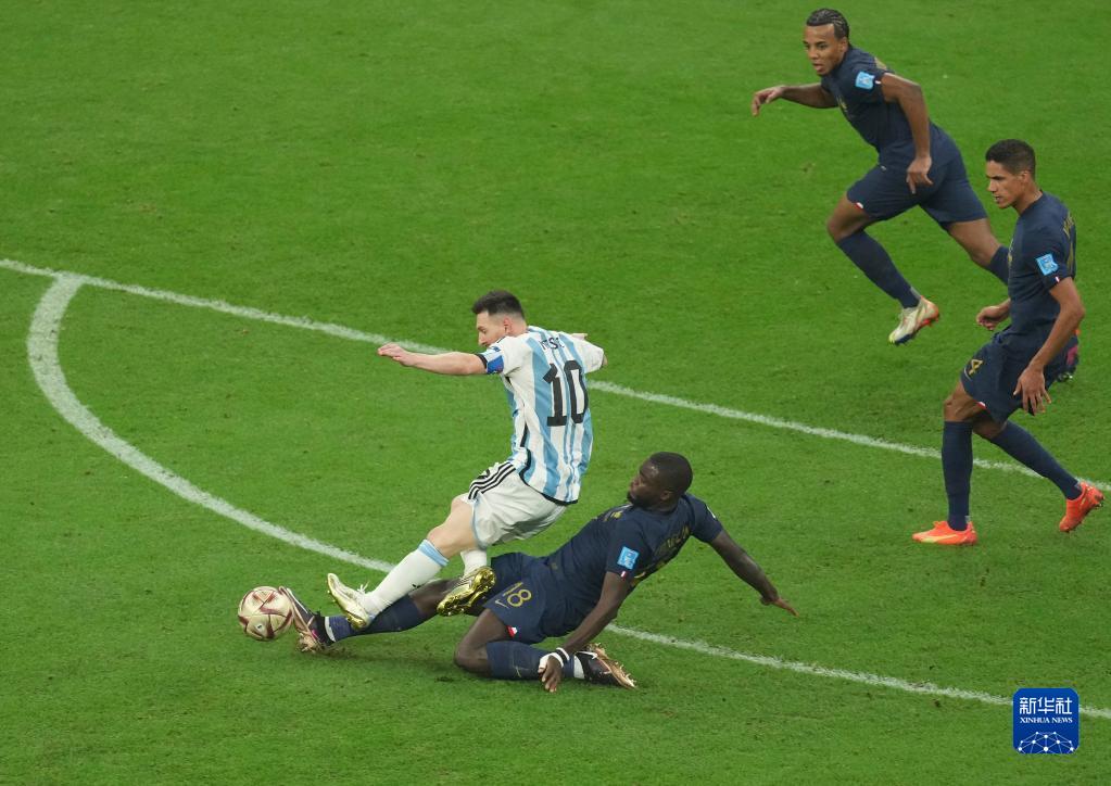 12月18日,阿根廷隊球員梅西(左一)在比賽中與法國隊球員于帕梅卡諾拼搶。新華社記者 潘昱龍 攝