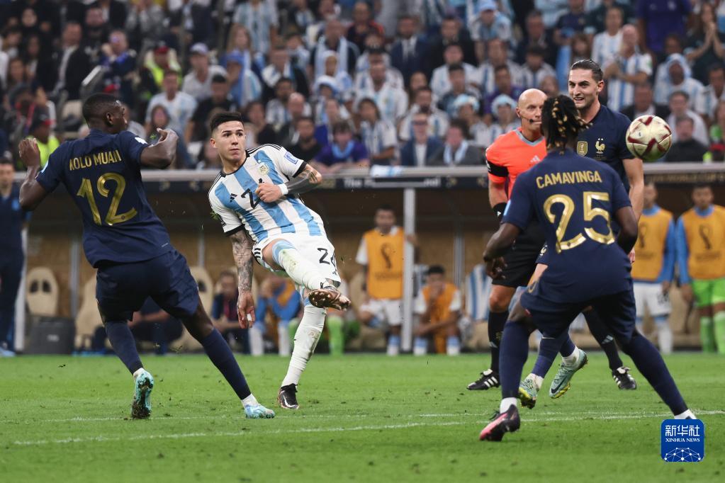 12月18日,阿根廷隊球員恩佐·費爾南德斯(左二)在比賽中射門。新華社記者 蘭紅光 攝