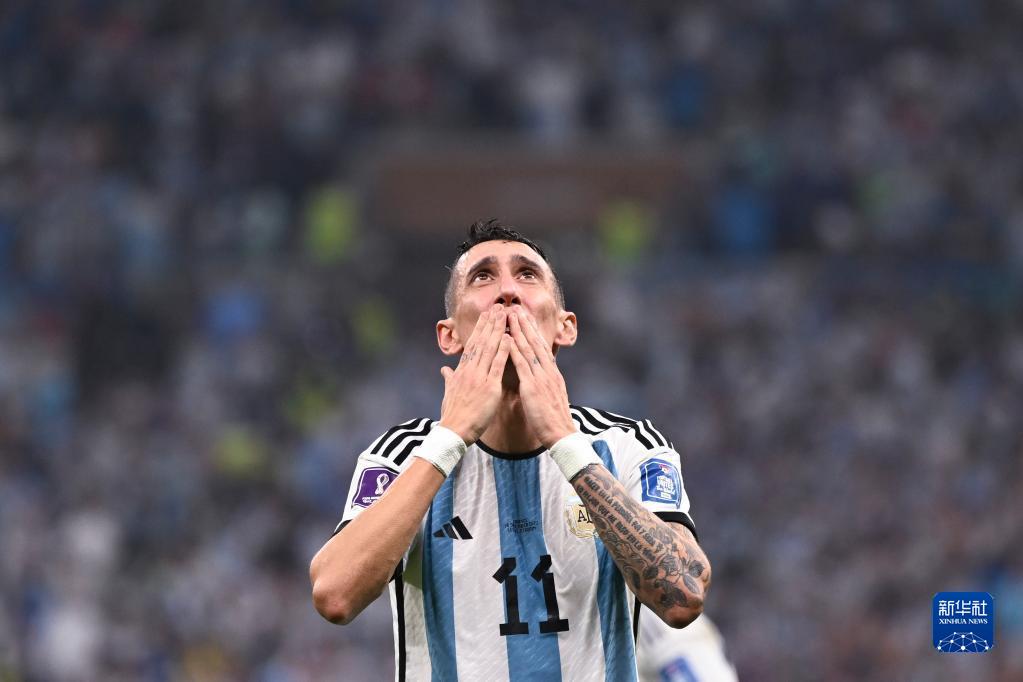 12月18日,阿根廷隊球員迪瑪利亞在比賽中進球后慶祝。新華社記者 李尕 攝